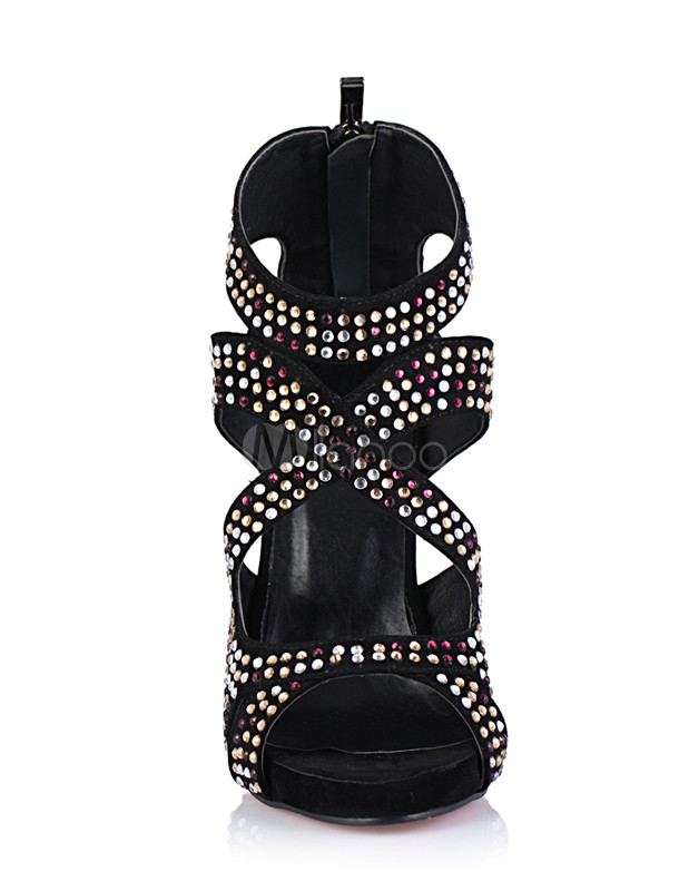 Black Rhinestone Zipper Open Toe Nubuck Woman's Gladiator Sandals ...